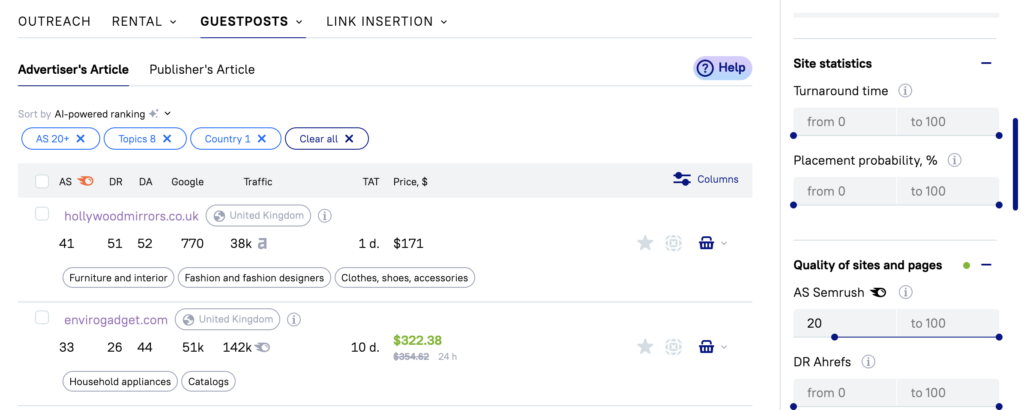 - Placement type: rental links, guest posts, link insertion, and submissions;