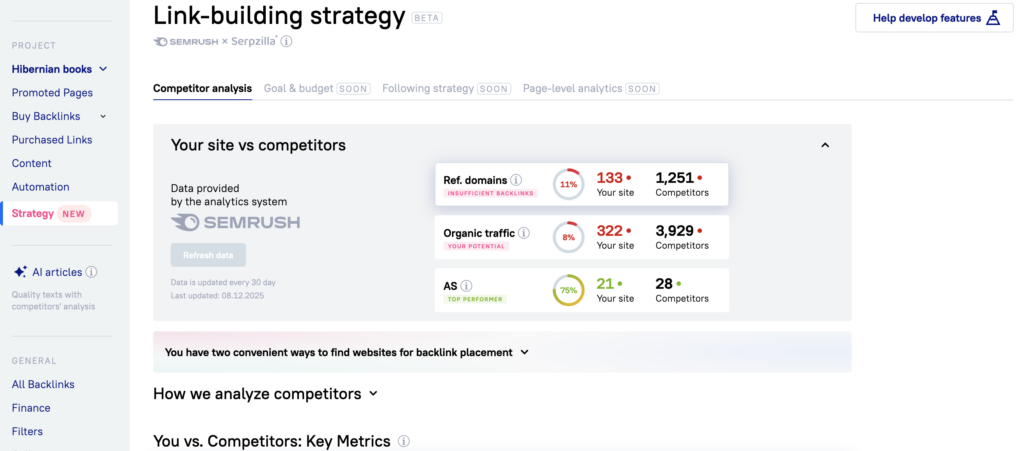To answer that question, we’re introducing Backlink Gap Analyzer, a new tool in Serpzilla designed to help you move from guesswork to data-driven link building. The tool analyzes backlink profiles using Semrush data and provides clear strategic recommendations based on real competitive gaps. Each account includes one free backlink strategy analysis, available for a single project, so you can test the approach and see actionable insights before scaling your workflow.