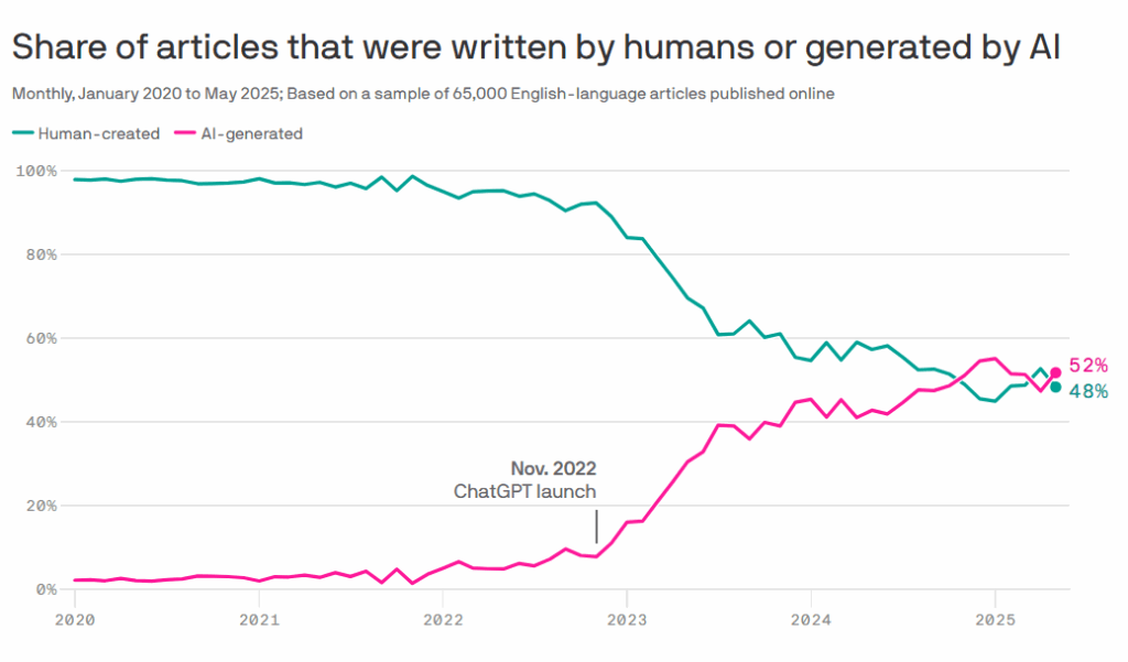 Recent research by Axios and Graphite states that over 50% of content available on the internet in 2025 is completely AI-generated, or at least to some visible extent. And yet, according to the same research, only 12% of this content pops up in Google search results.