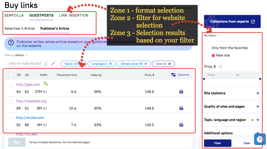 - Serpzilla — useful for finding relevant placements and spotting backlink gaps. Instead of chasing random high-DR sites, you can focus on sources that already influence your niche (and, by extension, AI answers).
