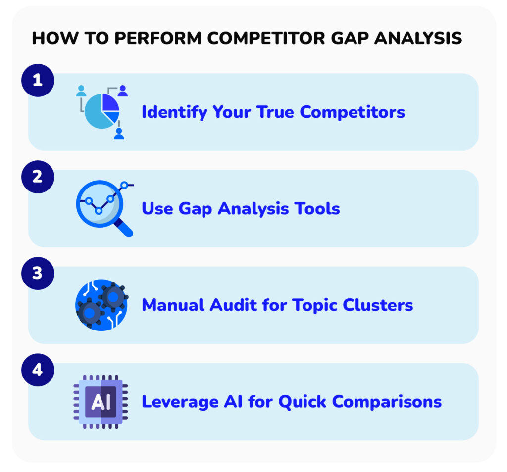 - Leverage AI for Quick Comparisons: You can use ChatGPT by giving it two lists (competitor topics vs yours) and ask for differences, as noted earlier. It might summarize that “Competitor X has a lot of content on [Topic Y] which you lack.” Use that as a pointer and then validate with your own analysis.