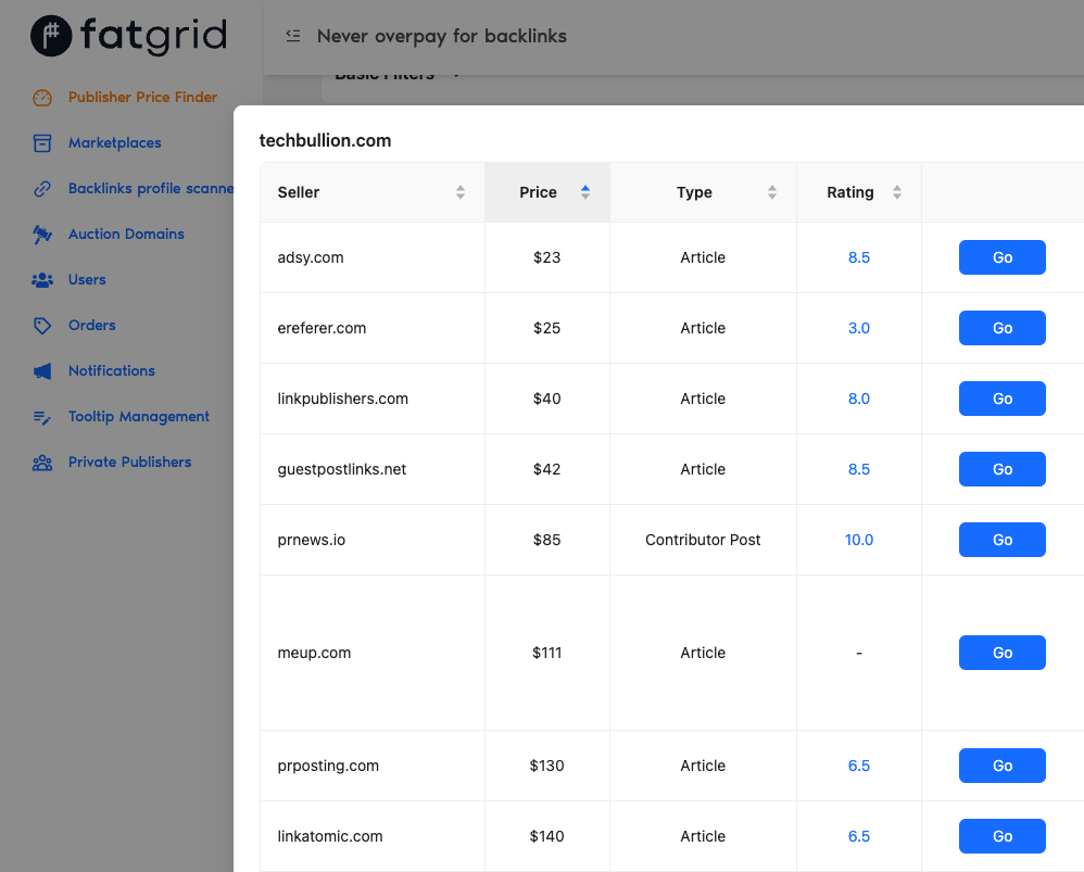 FatGrid is a link-building and backlink price-checking tool that provides fair market prices for links. It also provides publisher site performance metrics, along with their link prices from various marketplaces. The platform compares link prices and aggregates data from its inventory of over 340,000 sites to provide the best available link price.