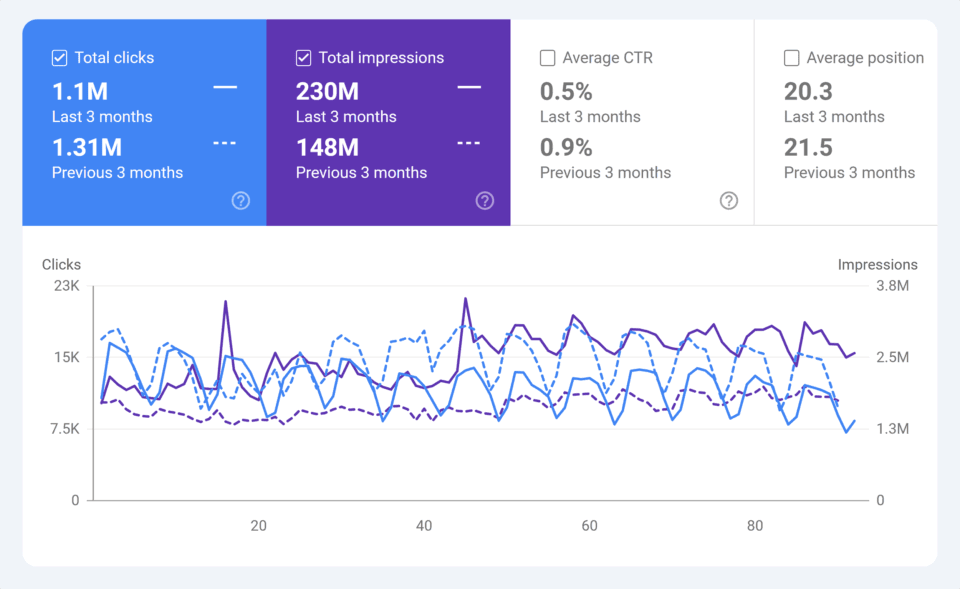 For example, Backlinko reports that over the last three months their clicks dropped by 15% while impressions skyrocketed by 54%: