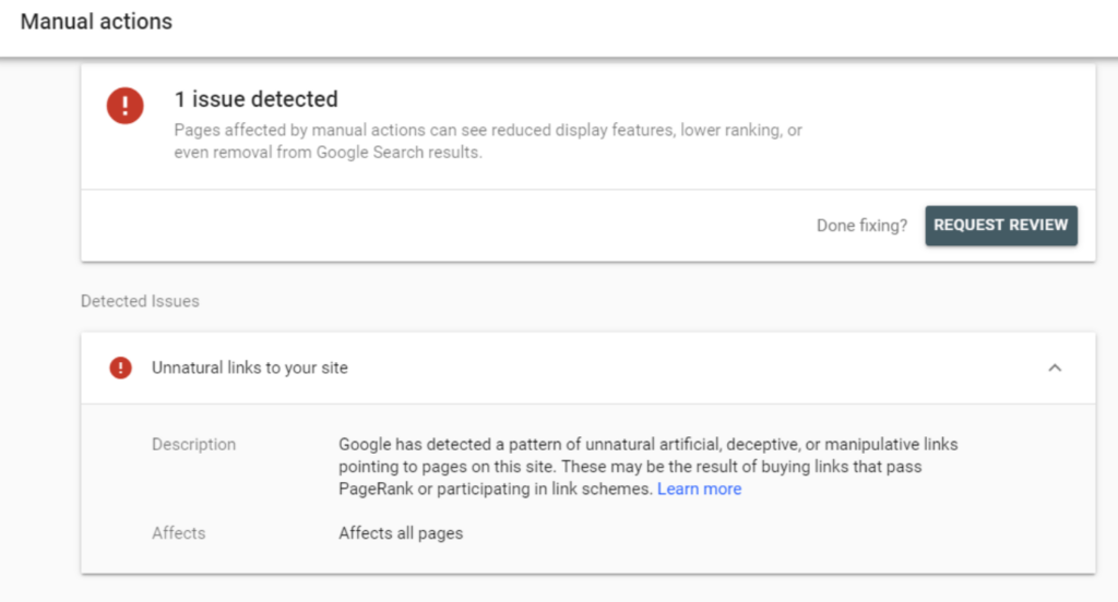 A manual action means Google’s spam team has reviewed your site and confirmed that it violates link spam policies. When this happens, you’ll see a notification in Google Search Console under Security & Manual Actions → Manual Actions. The message typically mentions “unnatural links to your site” or “unnatural links from your site.”