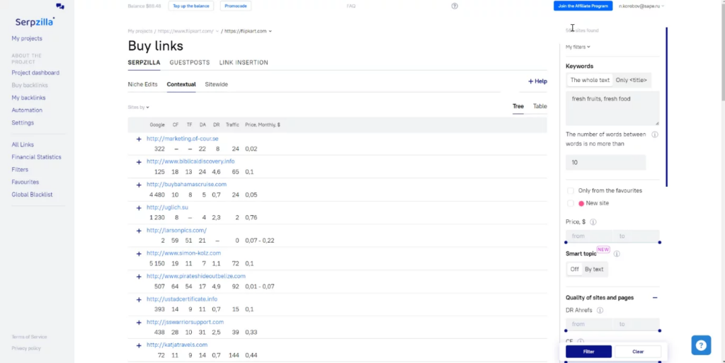In Serpzilla, you can immediately filter link opportunities by category, domain metrics, traffic, link type, and placement format. This approach makes it easier to match links to the specific goal of the campaign.