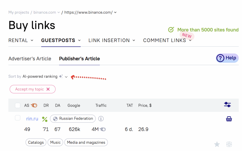 To access this feature: go to ‘Buy links’ → ‘Guest Posts’ or ‘Link Insertion’. You’ll be redirected to the “Buy links” page, where you can start setting up filters and see AI-Powered Ranking in action.
