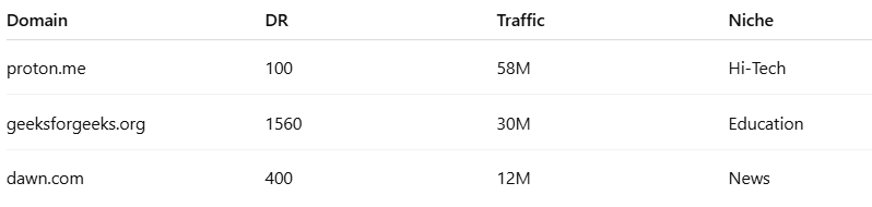 - SEO metrics: including domain authority, trust, traffic, and domain rating. This ensures that you’re choosing sites with strong SEO potential that can actually contribute to your link-building goals.