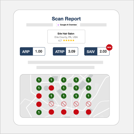 - What it does: Tracks AI Overview presence along with map results. It also measures Share of AI Voice (SAIV) by running searches across your geo-grid and tracking if an AI Overview appears and whether your brand is cited.
