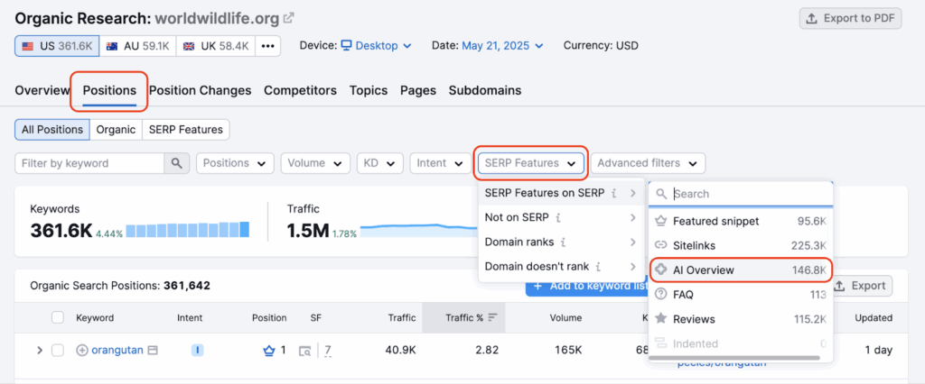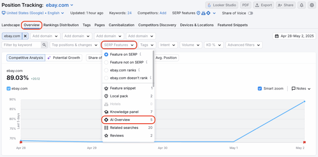 Pro tip: toggle the AI Overview feature filter on and off to see how your rankings look with and without AI panels — a great illustration of their impact.