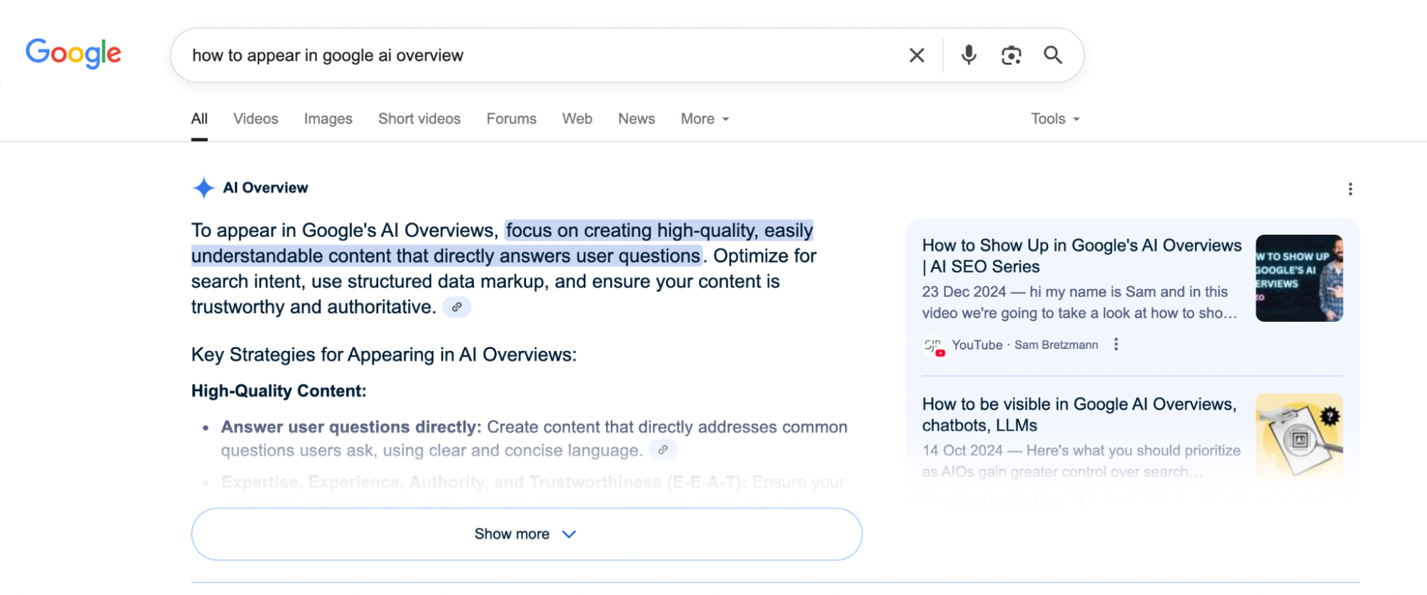 So you’ve got a system for tracking where you stand, but how do you earn spots in AI Overviews? You can’t force your way in, but you can shape your content so Google’s AI sees it as the most useful, reliable answer.
