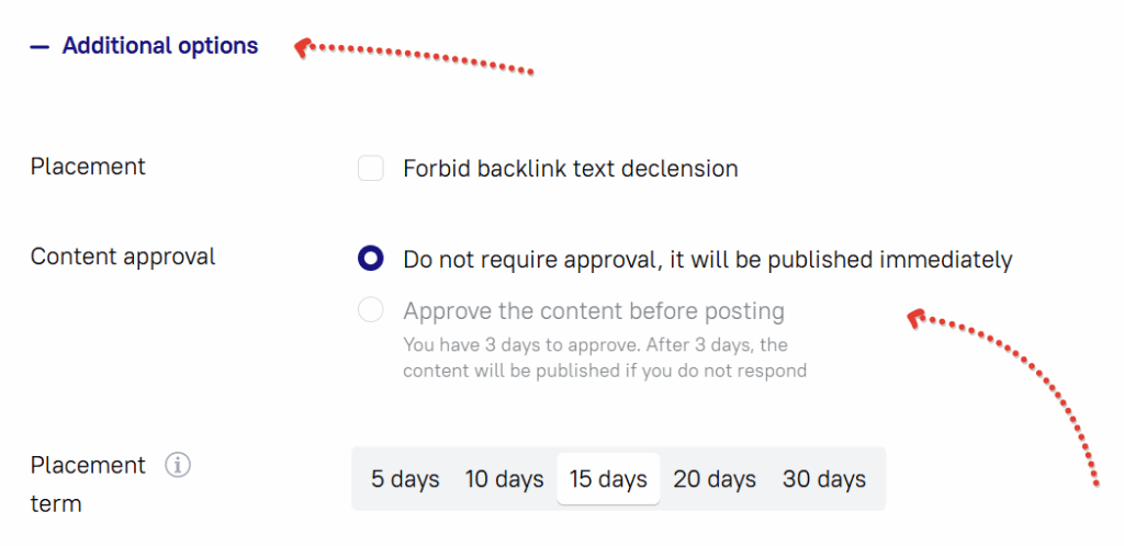 To enable this feature when ordering a guest post, you need to go to the ‘Additional options’ section of the form and under ‘Content Approval’ select the ‘Approve the content before publishing’ option.