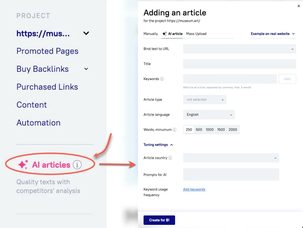 How to access: Go to your Serpzilla dashboard → AI Articles → fill in the form and hit Create.
